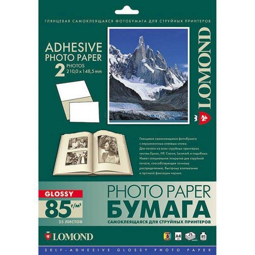 Самоклеящаяся фотобумага LOMOND, глянцевая, A4, неделённая (210 x 297 мм), 85 г/м2, 25 листов. арт.:2410003