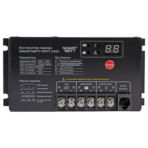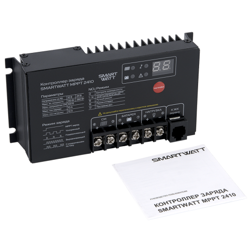 Контроллеры заряда SMARTWATT MPPT применяются в солнечных энергосистемах и предназначены для управления процессами заряда и разряда аккумуляторных батарей. Принцип работы MPPT контроллера основан на алгоритме слежения за точкой максимальной мощности, при этом выработка энергии происходит с максимальной эффективностью. MPPT контроллер, в отличие от обычного ШИМ (PWM) контроллера, позволяет увеличить эффективность энергосистемы примерно на 25%, за счет алгоритма слежения за точкой максимальной мощности солнечной батареи.